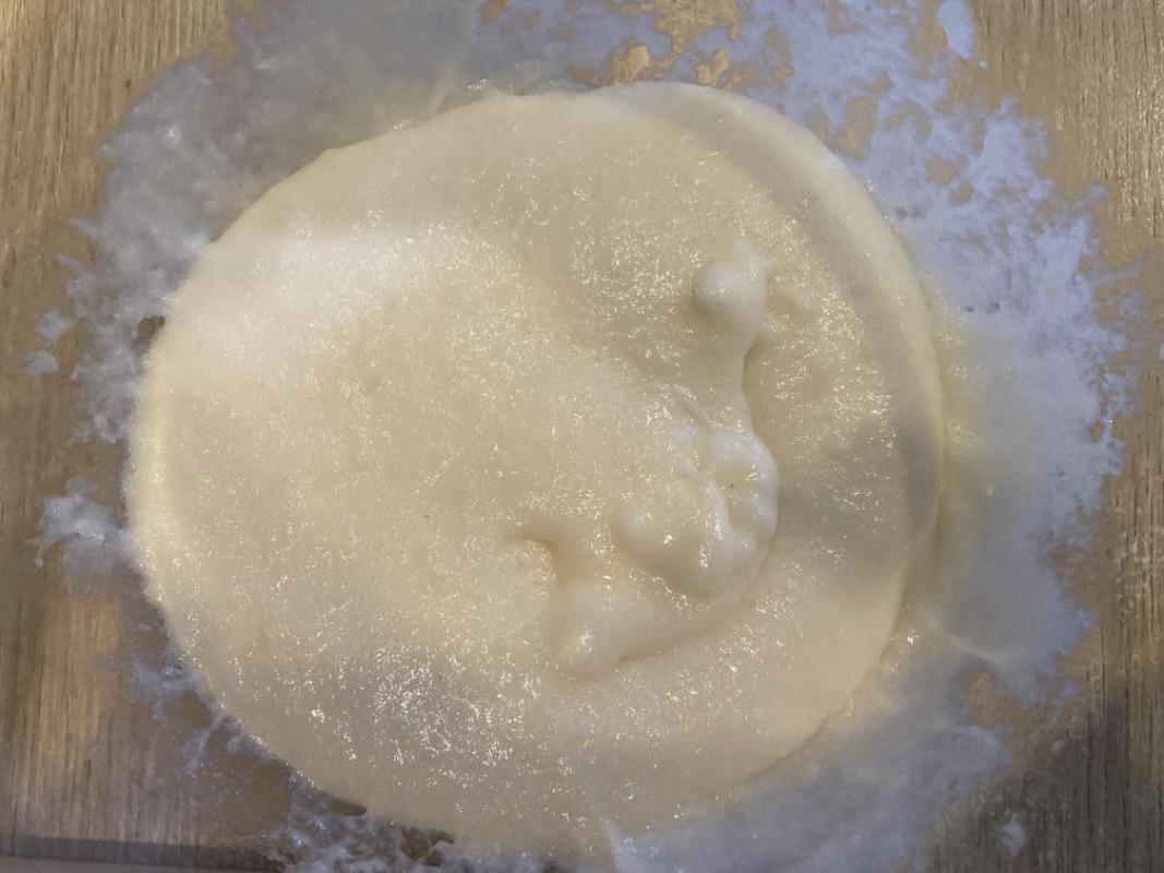 まな板の上に米粉を多めにぶちまけて、その上にもちもち潰したお餅をデーンと乗っけます。その後、手やまな板にお餅がくっつかないように、余っている米粉をお餅の上にもまぶしてあげてください。